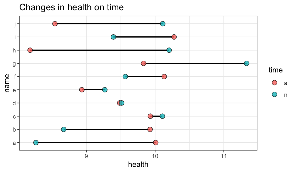 dd<-tibble(name=rep(letters[1:10],2),health=rnorm(20,10,1),time=rep(c('a','n'),each=10))#造一个数据包含每个样本俩个时间段的数据