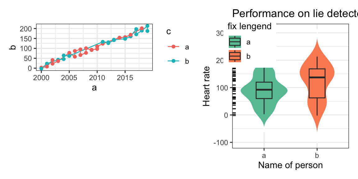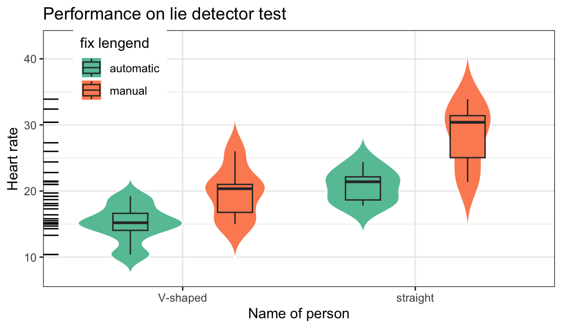 labs(x='Name of person',y='Heart rate',title = "Performance on lie detector test",fill="fix lengend")+