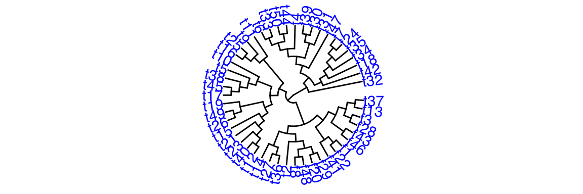 p=ggtree(hc,size = 0.8,linetype='dashed', layout="circular") %>%