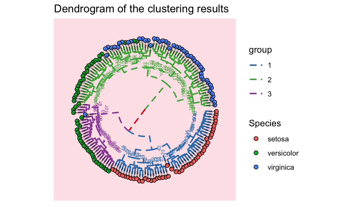 legend.title=element_text(size=5))+labs(title = "Dendrogram of the clustering results")+theme_tree("#FEE4E9")